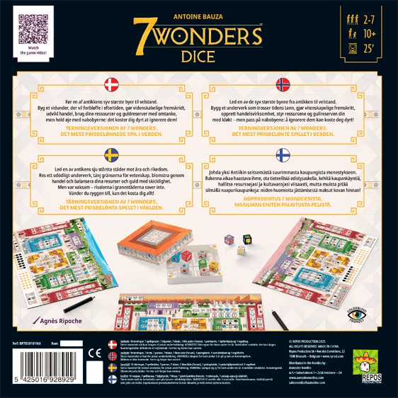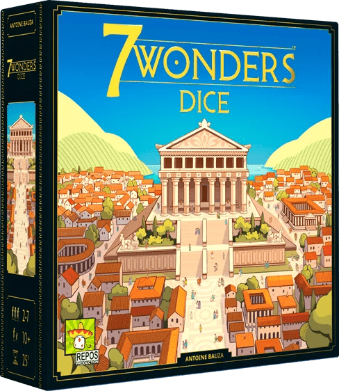 7 Wonders: Dice bygger på det prisvindende univers fra 7 Wonders, men introducerer et helt nyt terningebaseret system. Spillet indeholder specialterninger, afvaskelige spilleplader og markører til pointføring.