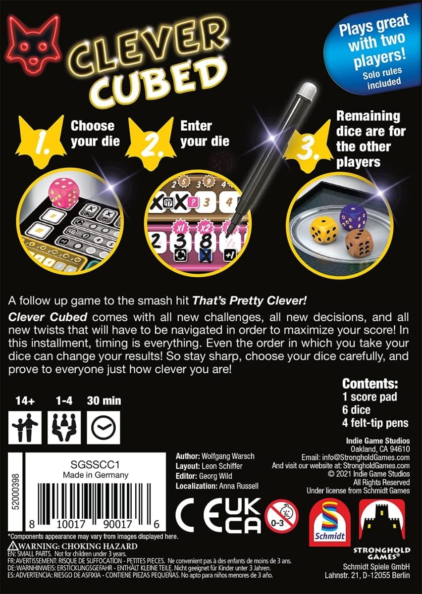 Clever Cubed er en terningspil-udgave af brætspillet "Ganz schön clever"