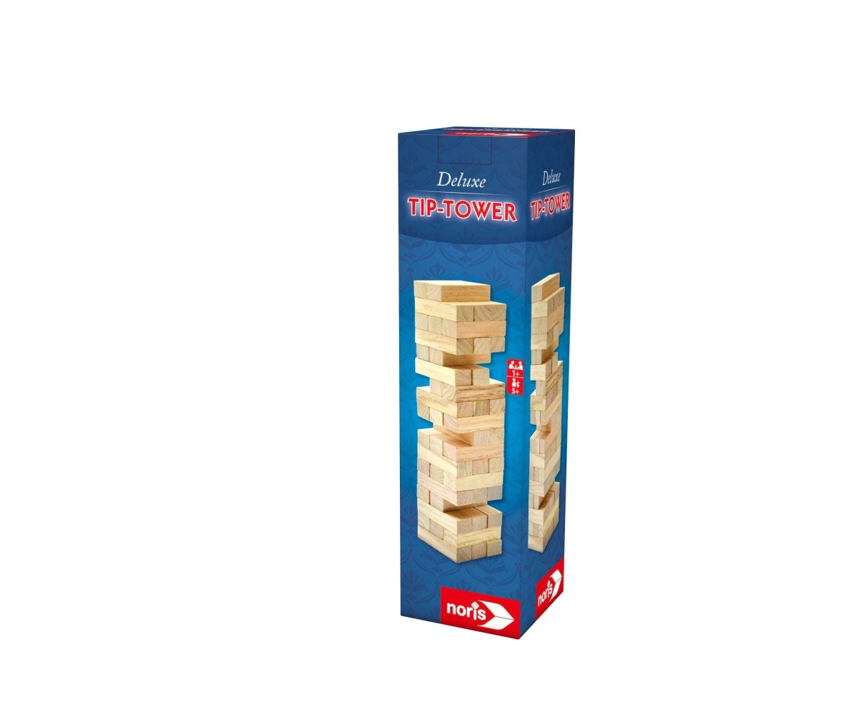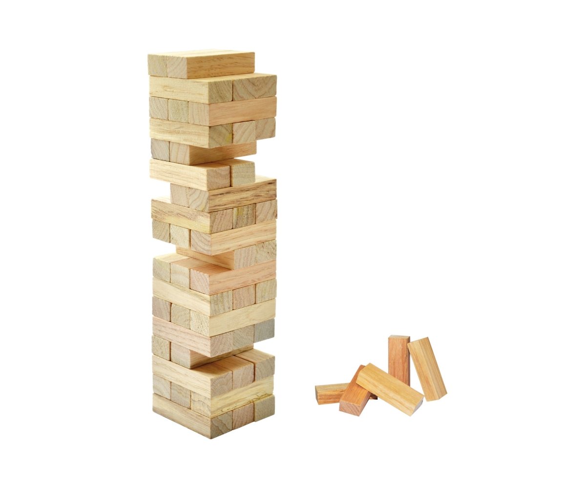 Træk på skift klodserne ud af tårnet og læg dem ovenpå, men pas på! Hvis du får tårnet til at vælte, vinder du titlen som Klodsmajor.