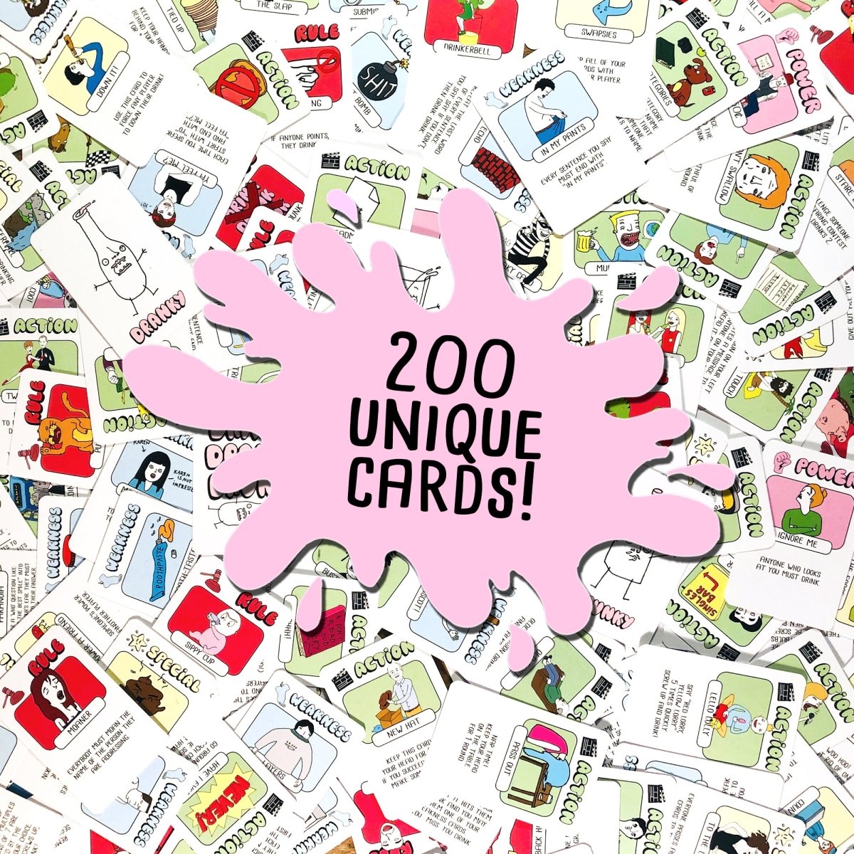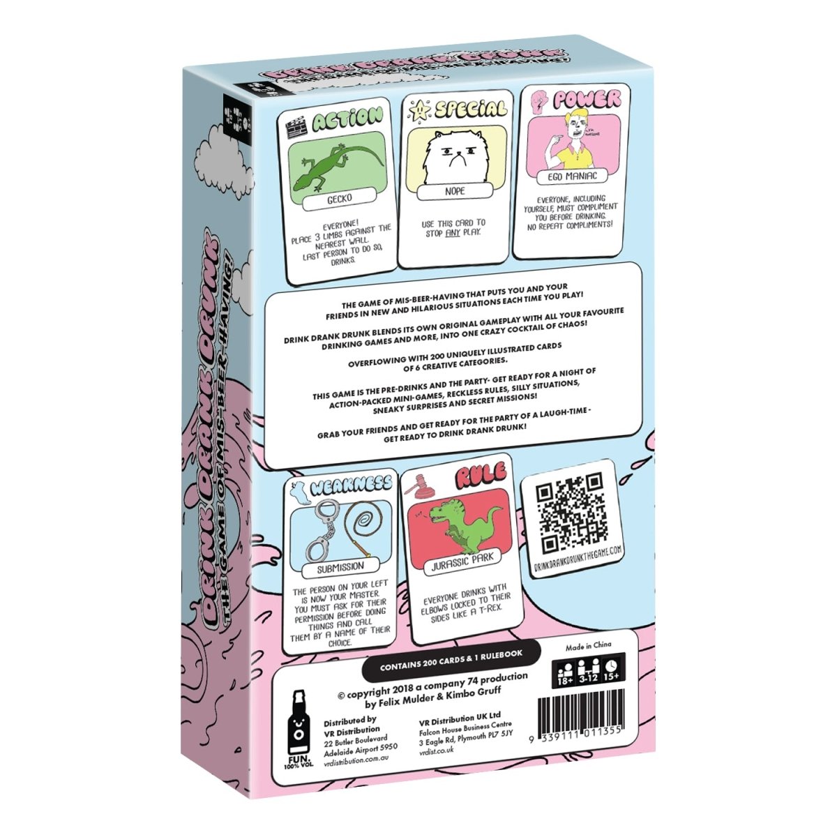 'Drink Drank Drunk' er det perfekte spil til enhver samling, hvor latter er i højsædet. Spillet er let at lære, men svært at lægge fra sig. Uanset om du er hjemme eller ude, vil dette spil med sine 200 kort og mange spilvarianter holde dig og dine venner underholdt hele natten. Spillet inkluderer seks typer kort: ACTION (Grøn) kort med mini-spil og udfordringer, RULE (Rød) kort, der sætter nye regler, POWER (Pink) kort med sjove evner, WEAKNESS (Blå) kort med personlige regler, SPECIAL (Gul) kort til hemmelige manøvrer, og WILD CARDS for alternative spilmetoder. Alt dette er pakket i en praktisk æske med en detaljeret spilleregler-pjece.