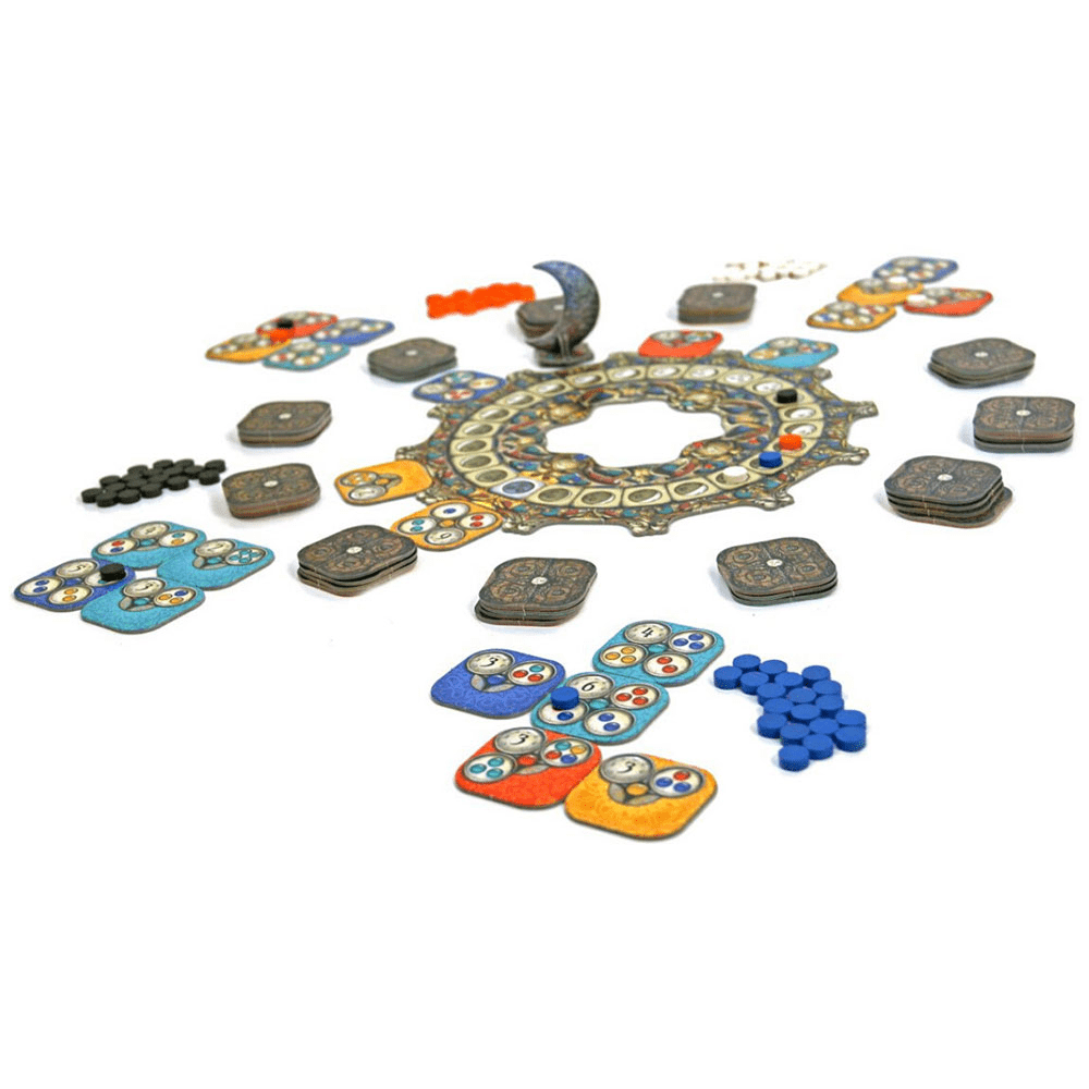 På hver tur skal du beslutte, hvilken ny flise fra månehjulet, der skal placeres foran dig. Hver nye flise bringer en ny opgave, du skal udføre. For at gøre det, skal du placere fliser i den rigtige farve ved siden af den opgave, du vil udføre, men disse bringer naturligvis igen nye opgaver. Hver gang en opgave er løst, kan du placere en af dine markører på den. Så vælg klogt og vær den første, der placerer alle dine markører.