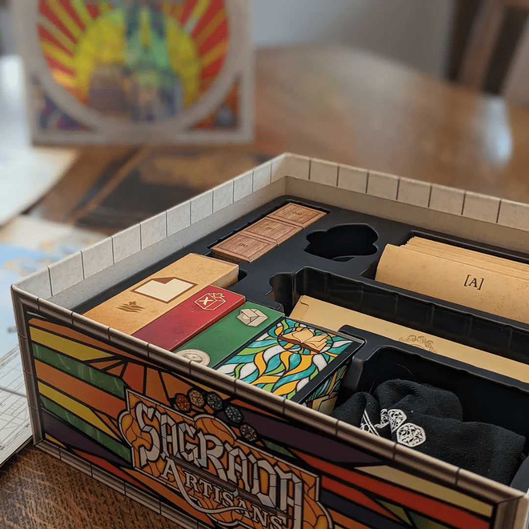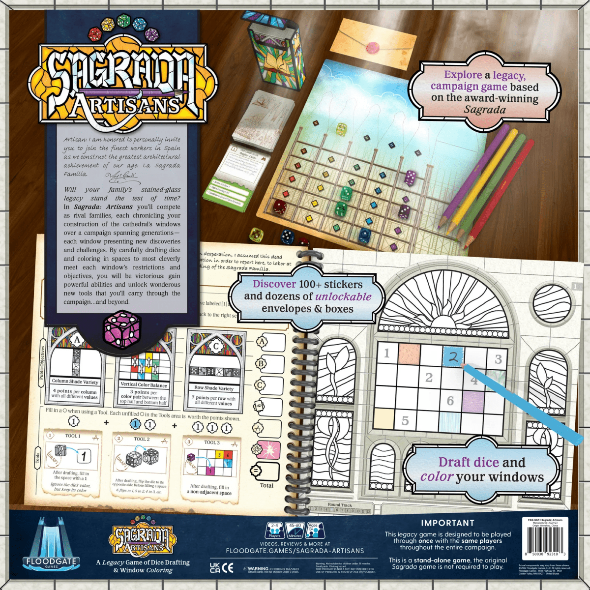 Gennem omhyggeligt valg af terninger og farvelægning, opfylder du vinduets specifikke krav og mål, og bringer din familie til sejr! Sagrada Artisans er et selvstændigt, der bygger på fundamentet af det populære spil Sagrada - Et spil med terninger og vinduesdesign. I vil sammen forme historien gennem mere end 10 unikke scenarier – hvor jeres valg har betydning for fremtidige spil med det medfølgende "Window Pattern Booster Pack".