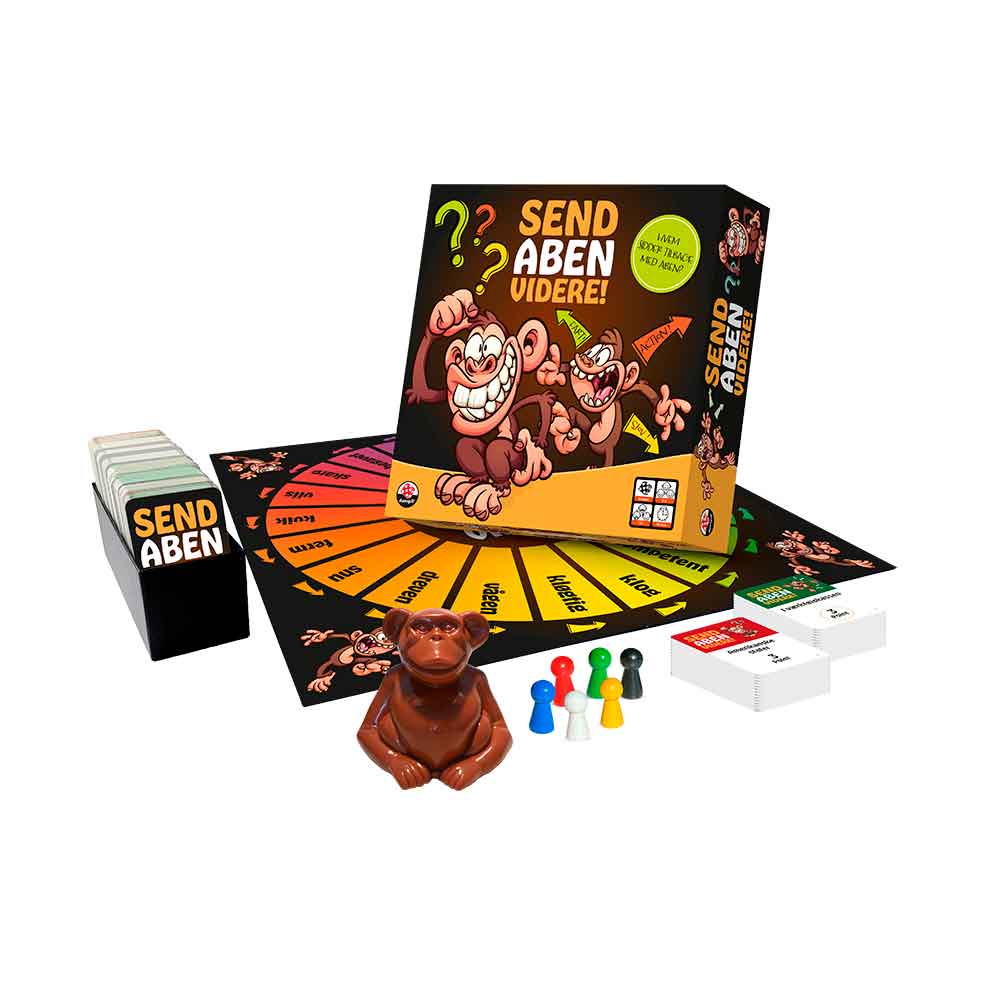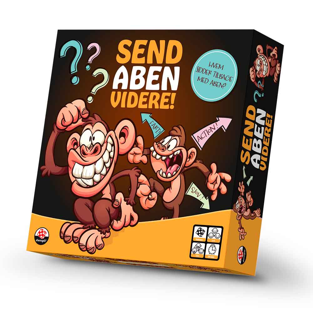 I "Send aben videre" gælder det om ikke at sidde tilbage med aben. Du starter med at trække et kort fra bunken og læse spørgsmålet højt. Er kortet markeret med rødt, skal du selv svare – er det grønt, sender du aben videre til en af de andre spillere. På kortet vises kategori, f.eks. bilmærker. Man starter tiden ved at samle aben op, og når man har svaret, giver man aben videre. Løber tiden ud før du når at svare, eller svarer du forkert - ja, så er det dig, der sidder med aben – bogstaveligt talt! Det betyder, at du har tabt runden, og du skal rykke din brik det antal felter, som er angivet på kortet, mod uret. Spillet er slut, når en spiller lander på taberfeltet. Den spiller, der til sidst er nærmest startfeltet, vinder.