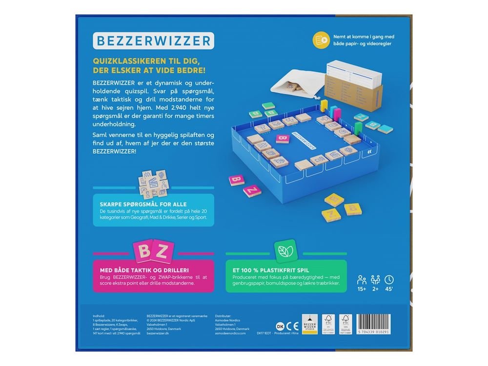 Æsken indeholder en spilleplade, kategoribrikker, Bezzerwizzer-brikker, Zwap-brikker og 147 kort med i alt 2.940 spørgsmål. Med danske spilleregler og et design, der tager hensyn til miljøet, er denne 2024-udgave en must-have for både quiz-entusiaster og miljøbevidste spillere.