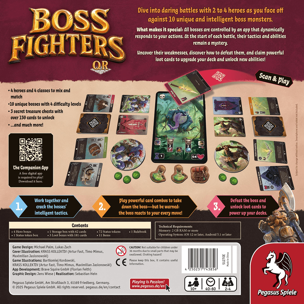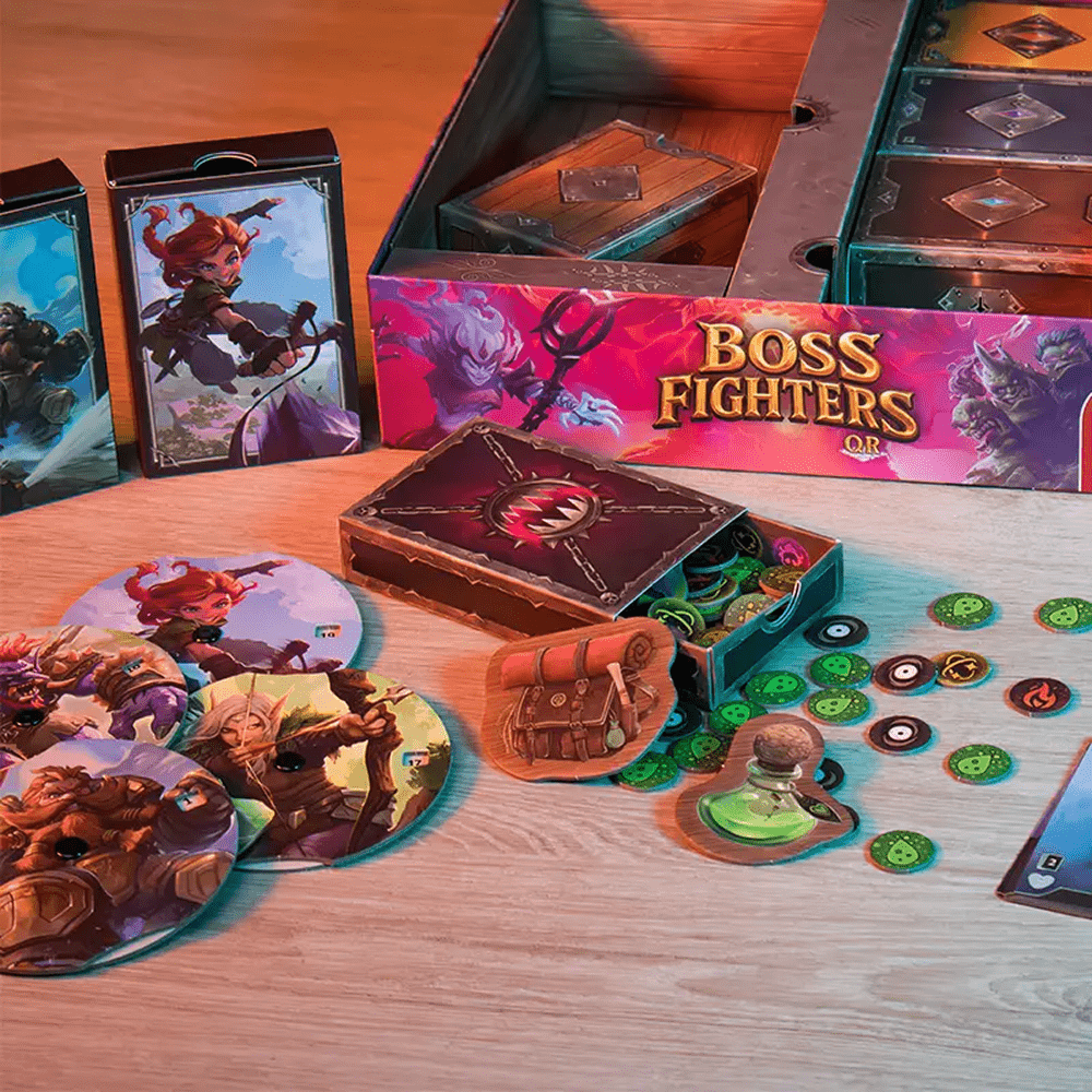 Boss Fighters QR er et co-op fantasyspil, hvor kortspil møder digital interaktivitet. I spiller som helte på en fælles kampagne og kæmper mod 10 unikke bosser, der styres fuldt ud af en app, som reagerer på jeres handlinger i realtid.