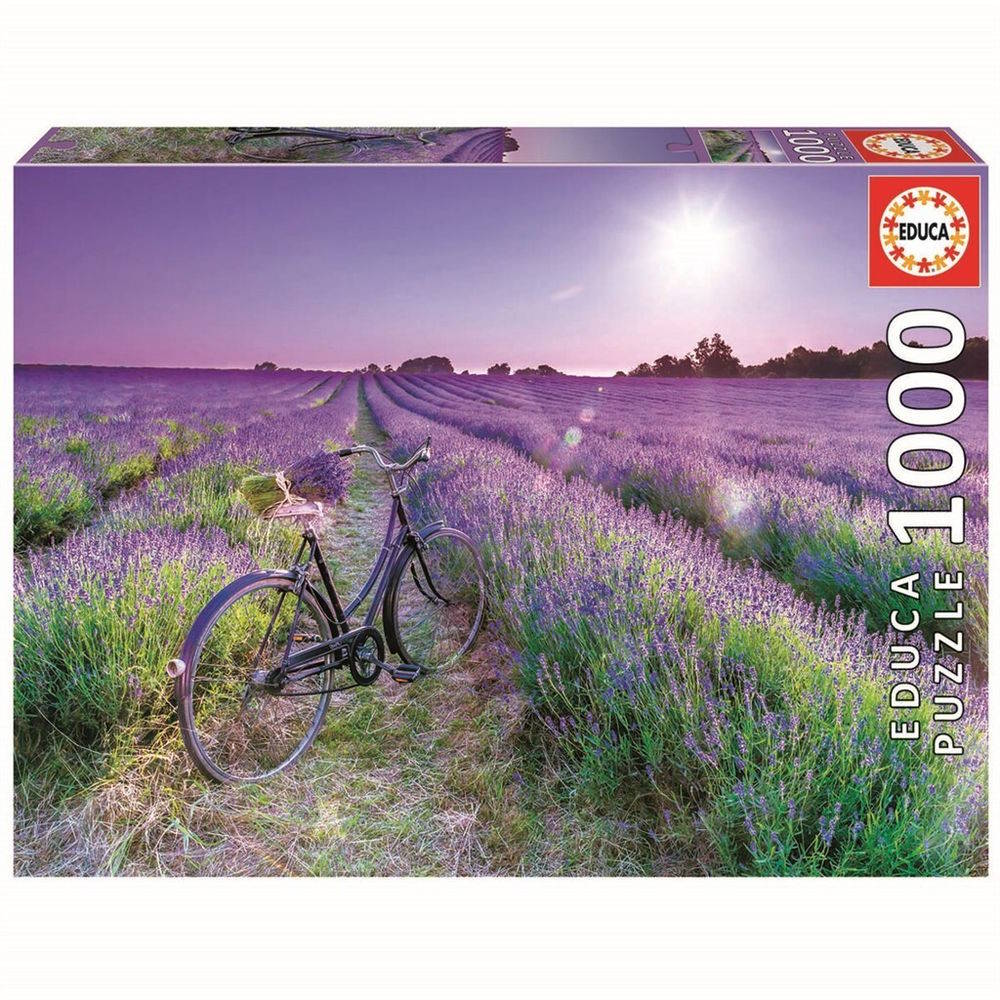 Dyk ned i naturens ro med dette smukke puslespil fra Educa. Motivet viser en blå cykel parkeret midt i en endeløs, lilla lavendelmark, der strækker sig mod horisonten under den klare himmel.