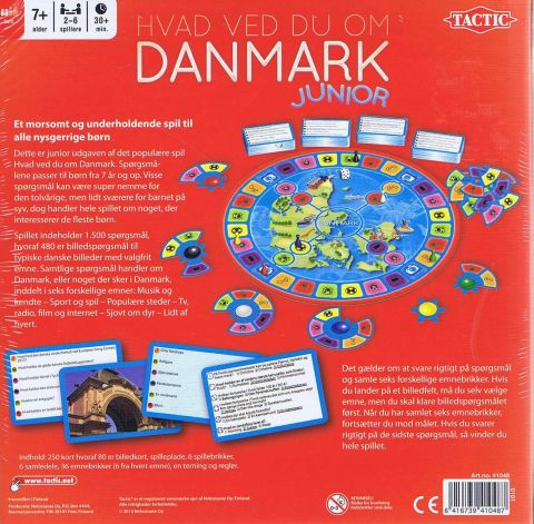 Dette er j unior udgaven af det populære spil Hvad ved du om Danmark. Spørgsmålene passer til børn fra 7 år og op. Visse spørgsmål kan være super nemme for den tolvårige, men lidt sværere for barnet på syv, dog handler hele spillet om noget, der interesserer de fleste børn.