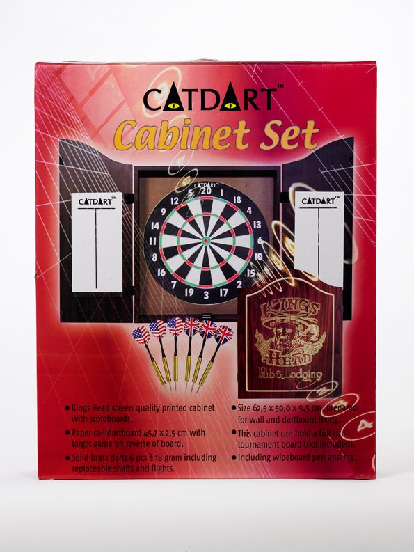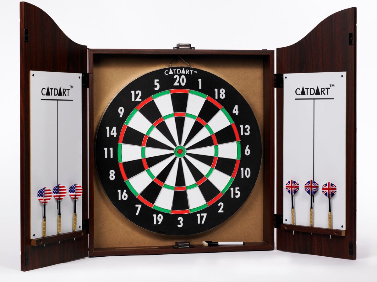 I det flotte udsmykkede skab gemmer sig en dartskive og tilhørende pile. Hæng skabet op, og åbn blot lågerne for at sætte gang i dysten. Indvendigt på lågerne er der tilmed en fin tavle hvor i kan holde styr på pointene.