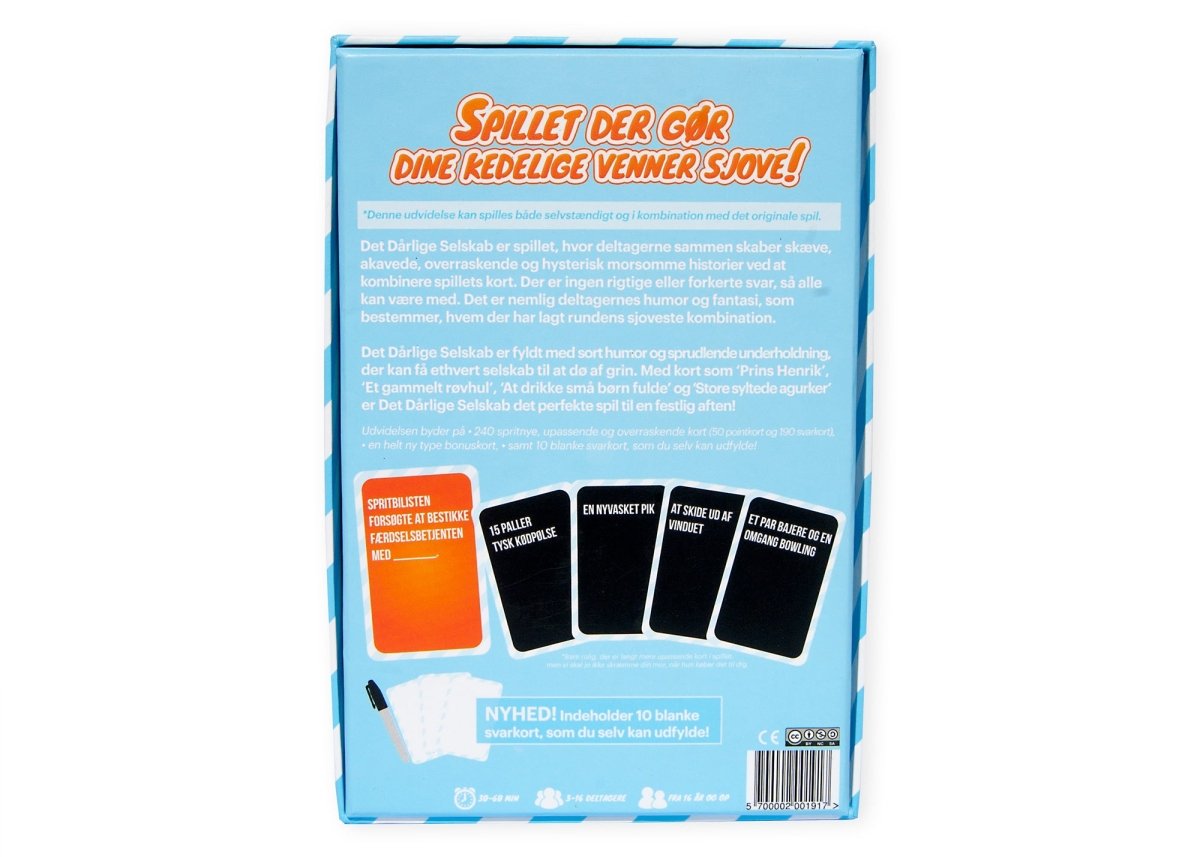 Det Dårlige Selskab: Udvidelse #1 giver dig endnu flere skøre, vilde og upassende kort til et af Danmarks mest populære selskabsspil. Med denne udvidelse kan du forlænge grinene, få helt nye kombinationer og tilføje en ekstra dimension til spillet.