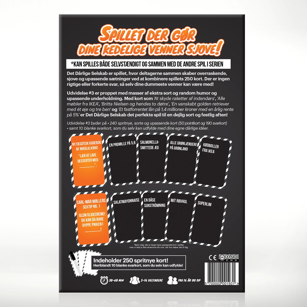 Det Dårlige Selskab: Udvidelse #3 tager det populære selskabsspil til nye højder med endnu mere sort humor. Denne tredje udvidelse giver jer helt nye muligheder for at skabe de mest upassende og lattervækkende kombinationer – perfekt til en aften, hvor der ikke er nogen grænser for, hvor langt man kan gå.