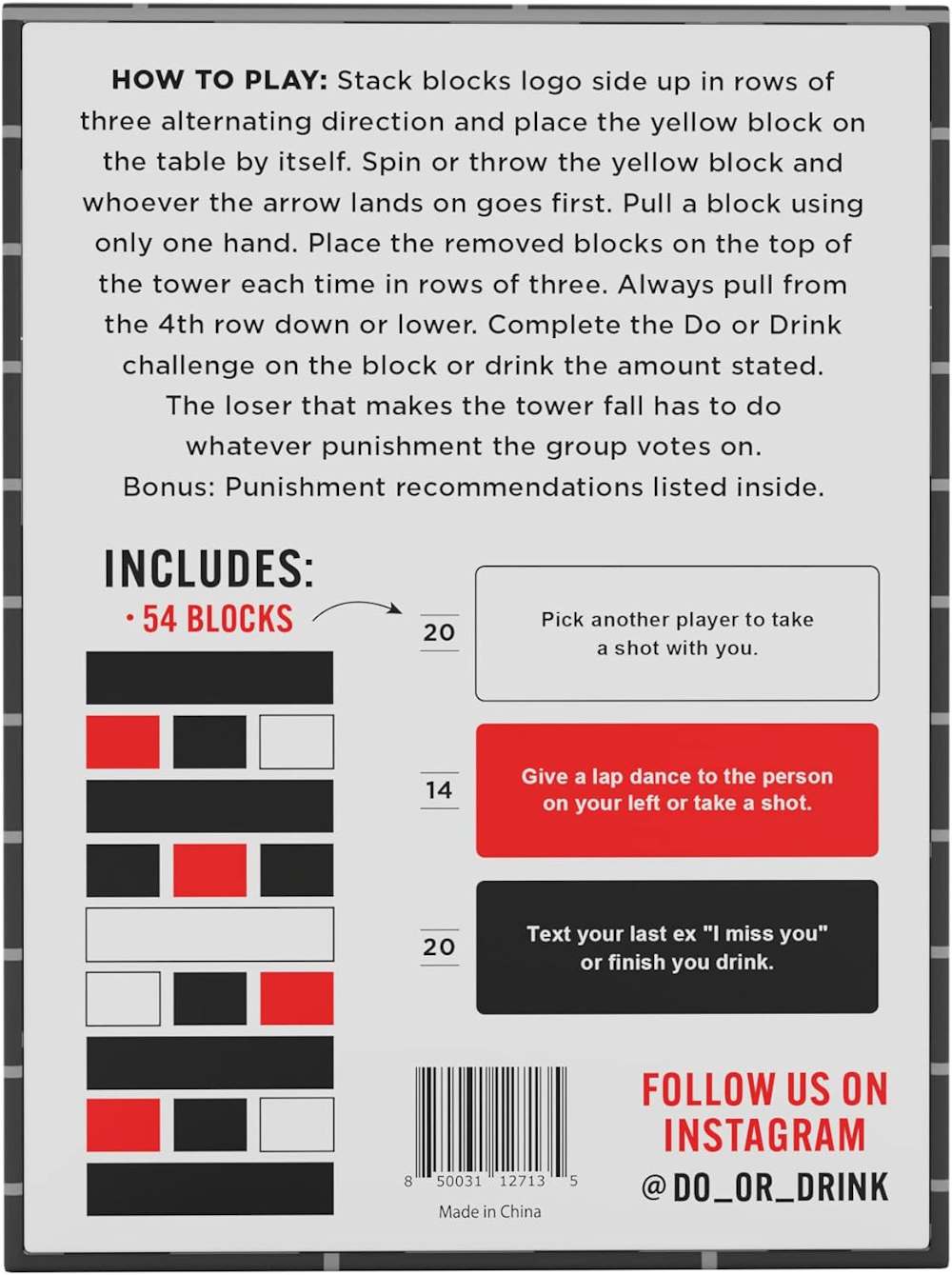 Spillet indeholder 54 udfordringsklodser, som sikrer timevis af underholdning. Træk en klods, udfør udfordringen – eller drik! Hvis du vælter tårnet, venter en straf, som gruppen bestemmer. Med enkle regler og masser af variation er dette spil let at gå til og skaber den perfekte feststemning, uanset hvor du er.