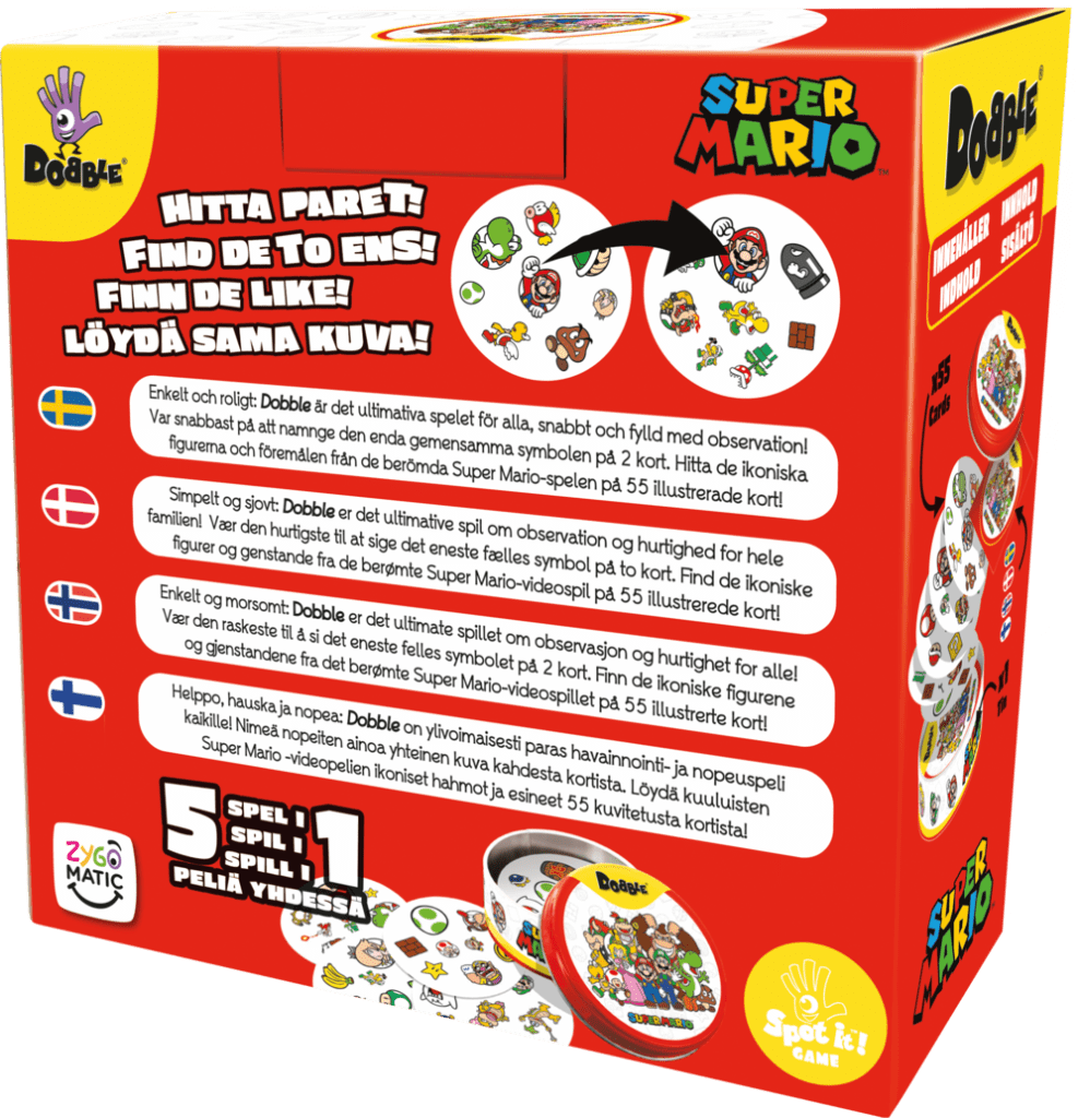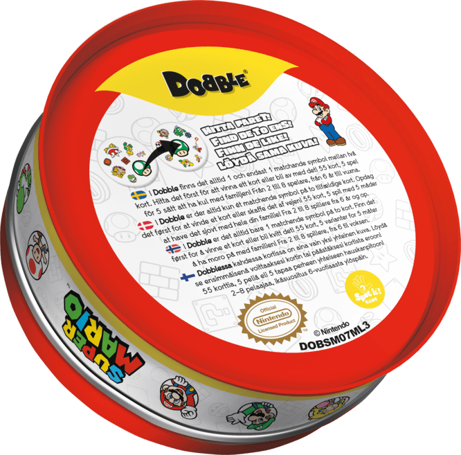 Spillet indeholder figurer som Mario, Luigi, Prinsesse Peach, Bowser og Yoshi, og det er din opgave at finde de matchende symboler hurtigere end dine modstandere. Med sine enkle regler og hurtige tempo er Dobble: Super Mario perfekt til både børn og voksne, og det garanterer sjove og spændende stunder for hele familien.