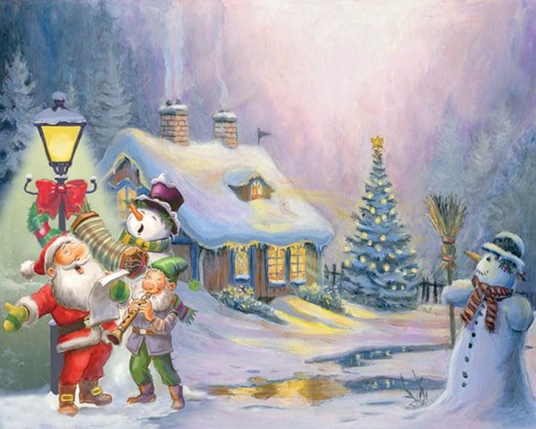 Et hyggeligt julemotiv, hvor julemanden og børnene synger julesange foran et sneklædt hus pyntet med lys og juletræ. Stemningen er varm og fredfyldt – den perfekte kombination af vinter, tradition og nostalgi.