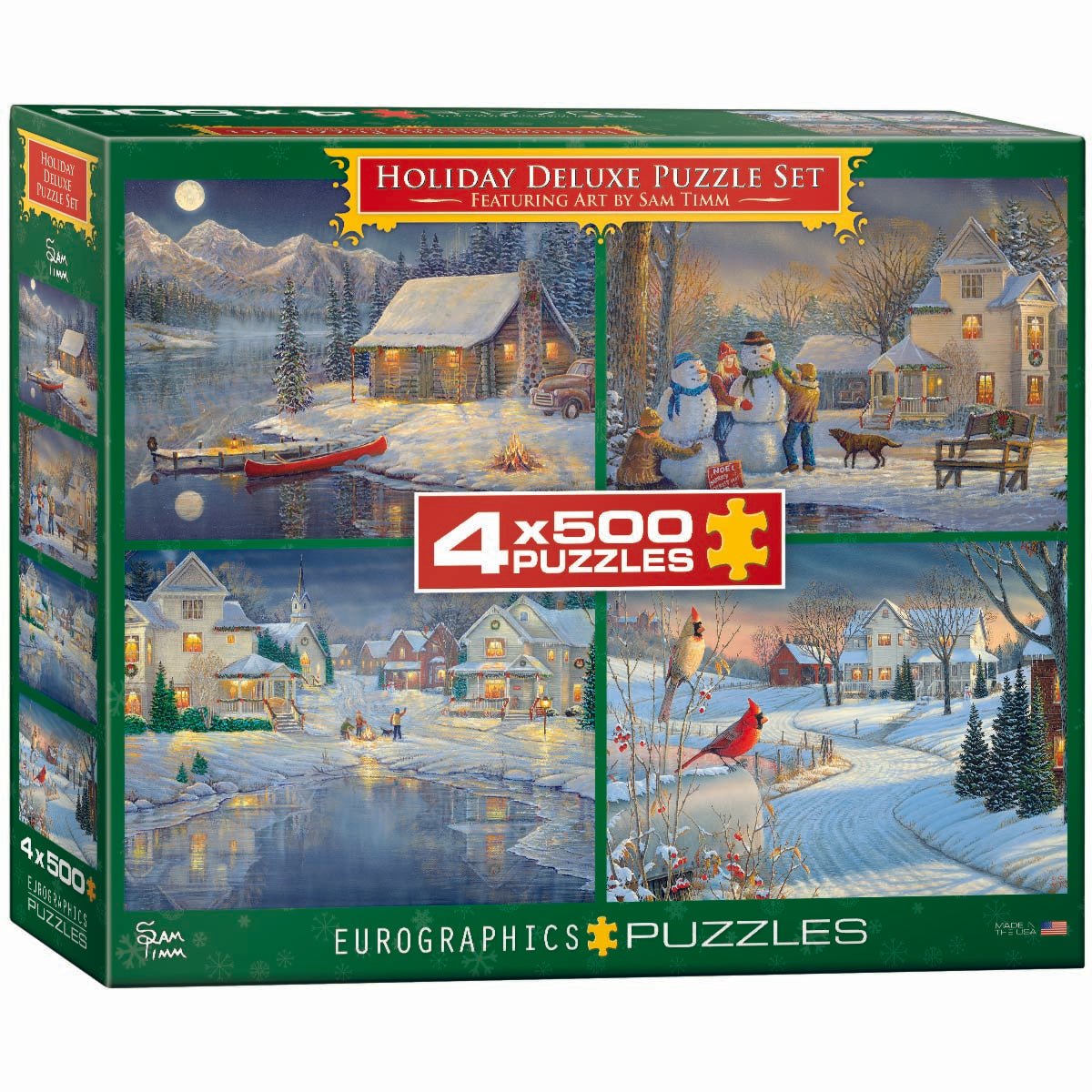 Julestemningen er sikret med dette smukke puslespilssæt fra Eurographics, som indeholder 4 forskellige julemotiver malet af kunstneren Sam Timm. Hvert motiv indfanger den rolige og idylliske vinterstemning – fra sneklædte landsbyer og hyggelige hytter til glade snemænd og varm juleglæde.