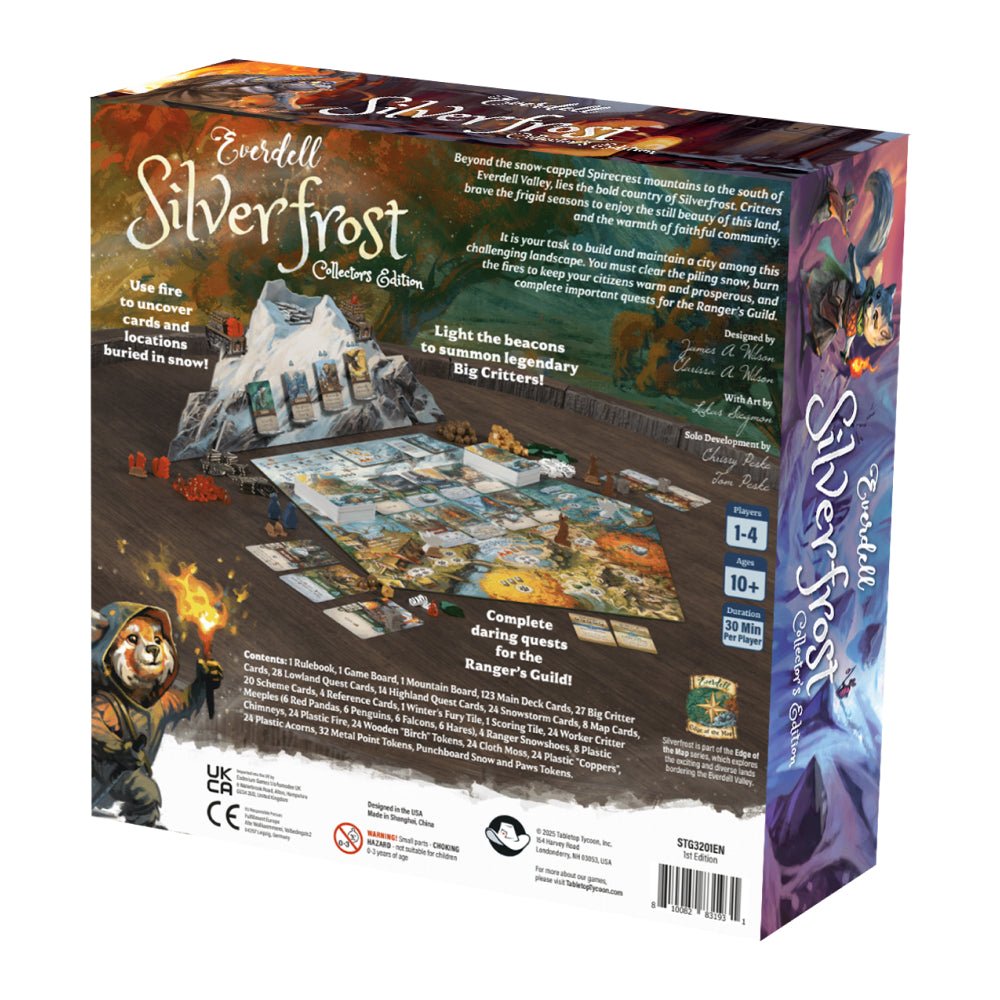 Rejs syd for Everdell dalen til landet Silverfrost, hvor bjergene er dækket af sne, og vinteren sætter alt på prøve. Stemningen er eventyrlig og rolig, men også fyldt med strategiske valg, når du skal holde dine borgere varme og byen i live.
