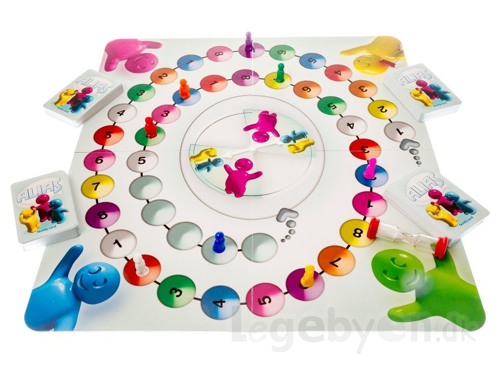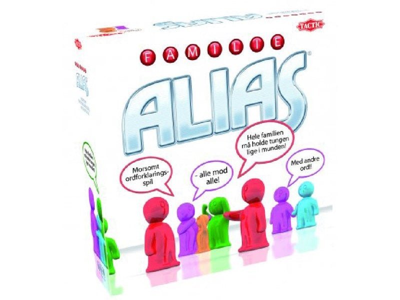 Familie Alias handler om ordforklaring. Det betyder at når det er ens tur, så skal man forklare så mange ord som muligt fra et af spillekortene. Der er dog regler for, hvilke ord du må bruge til at forklare ordet med. Hvis du eksempelvis skal forklare ordet ”sur” kan du forklare det med sætninger: ”Det modsatte af sød”. Spillet inkluderer en spinner, som gør det nemt at finde ud af, hvem fra familien, der skal gætte ordet, som du forklarer. Spinneren drejes nemlig på og den, som pilen pger på er den person, som skal gætte. Der er både familiekort og voksenkort, således at sværhedsgraden kan justeres, hvis voksne også skal udfordres. Familie Alias er et spil til alle i familien fra 7 år og opefter. Et spil tager typisk 45 minutter og man kan være 3-8 spillere om en runde.