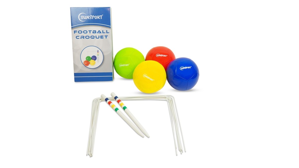 Fodbold Kroket er en helt ny version af kroket. Et underholdende udendørs spil for hele familien. Alle kan være med til Fodbold Kroket, og det er især en fordel for dig, hvis du allerede er super god til fodbold. I Fodbold Kroket vinder du nemlig spillet med fodbolde i stedet for en kølle og nogle små bolde, som du skal ramme køllen med. Her gælder det om at bruge dine ben, og være den første til at sparke bolden gennem buerne.
