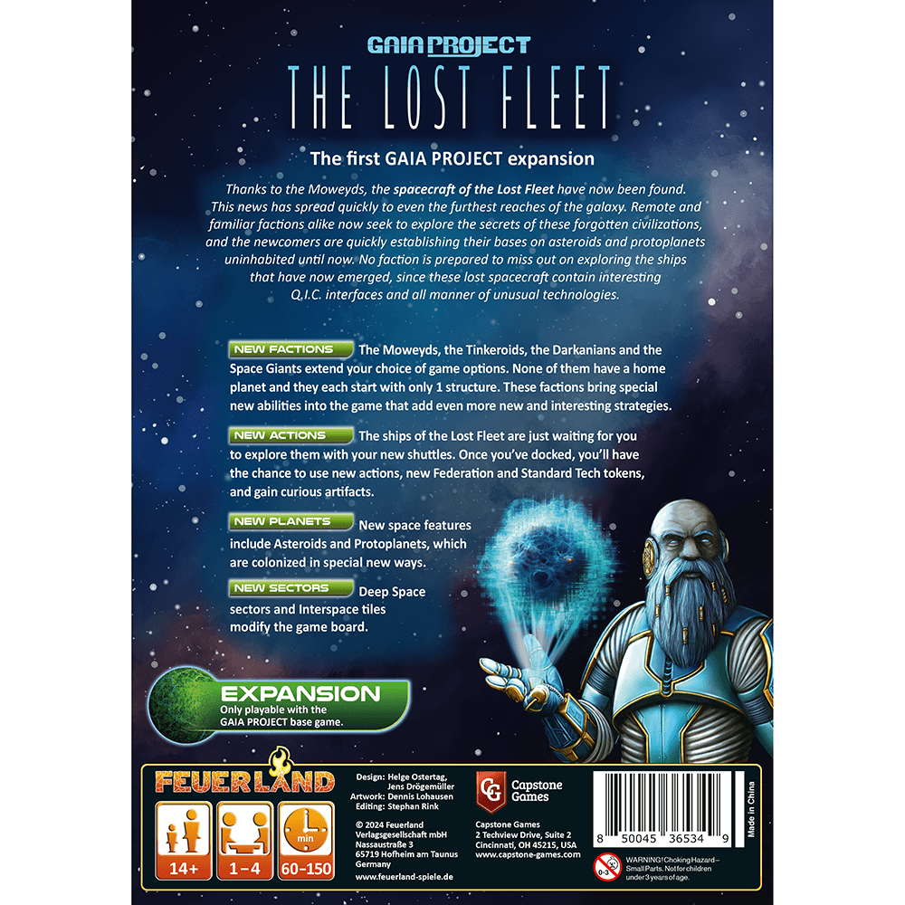 Udvid universet i Gaia Project med The Lost Fleet. Udvidelsen introducerer nye fraktioner, planettyper og et modulært kort med særlige sektorer og rumskibe, der åbner for helt nye handlinger og strategier. Bemærk: Dette er en udvidelse og kræver basisspillet Gaia Project.