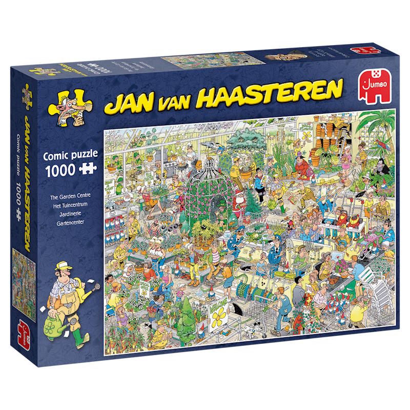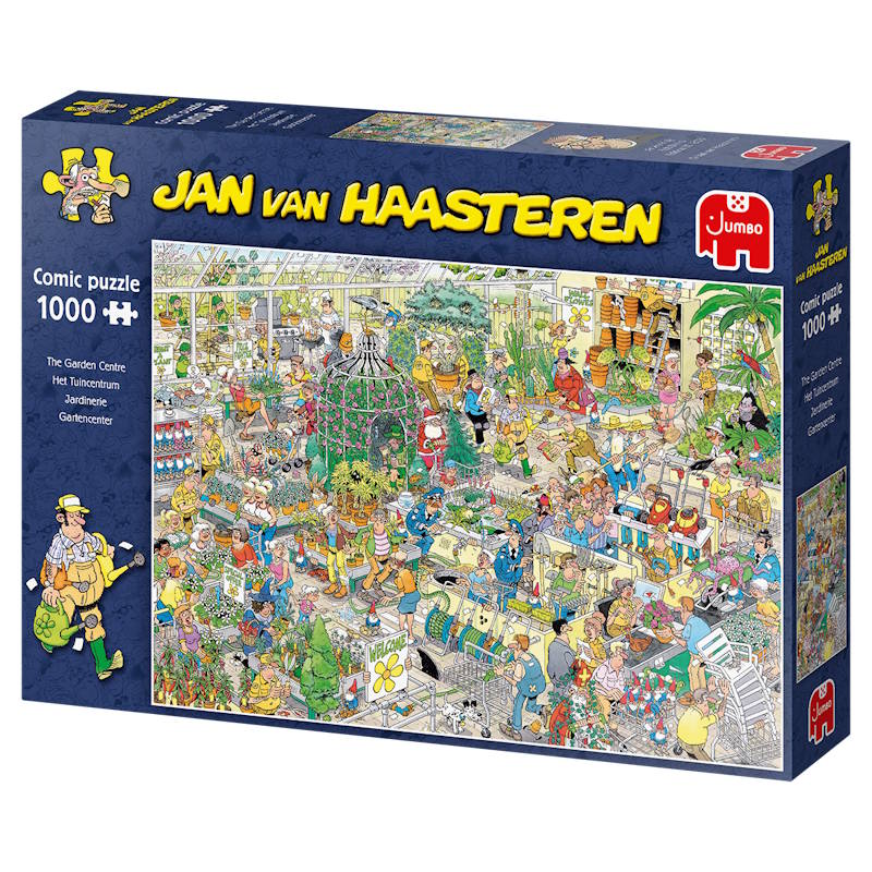 I dette 1.000-brikkers puslespil fra Jan van Haasteren-serien er der fuld fart på i havecentret! Kunder og ansatte bevæger sig rundt mellem planter, potter og haveredskaber, men som altid er der mere kaos end orden. Noget tyder på, at det grønne liv ikke er helt så roligt, som man skulle tro!
