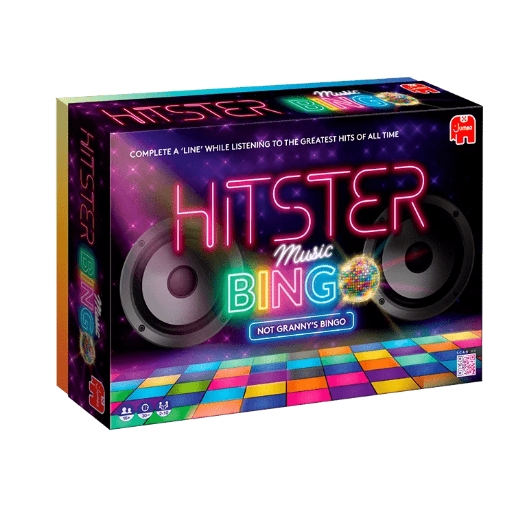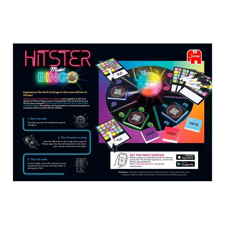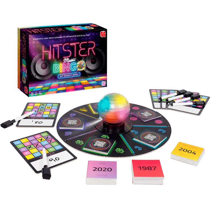 Drej den elektroniske discokugle, scan et kort med Hitster-appen, og lad musikken spille. Du kan få spørgsmål om alt fra årti til præcist årstal – og hvis du svarer rigtigt, må du markere feltet på din bingoplade. Første spiller med en fuld række vinder!
