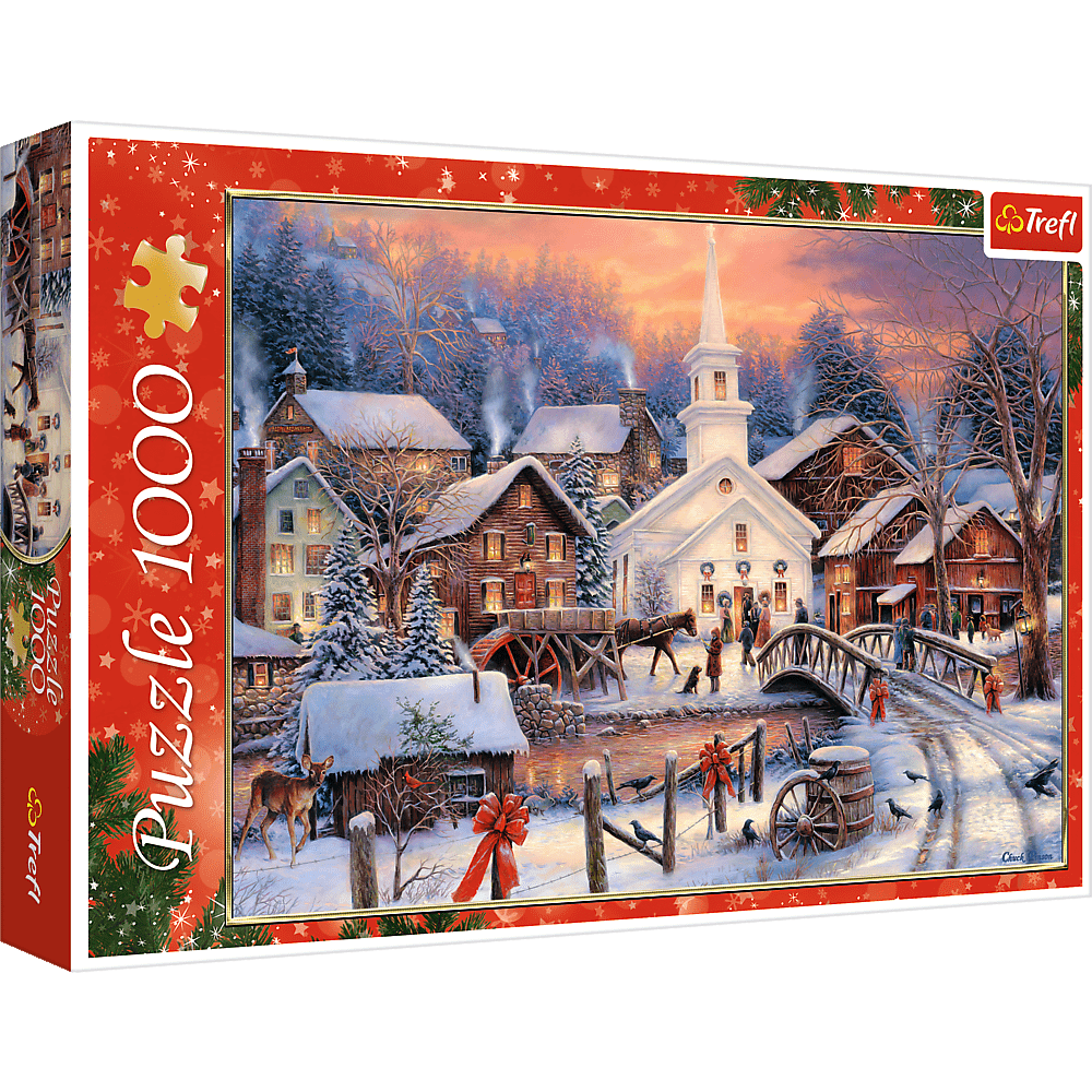 Trefl Puslespil med motiv af en snedækket by tegnet af Chuck Pinson.