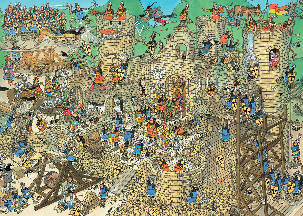 Kampen om borgen er i fuld gang! Overalt kæmpes der indædt mellem riddere, soldater – og endda en heks, der blander sig i slaget med sine magiske kræfter. Der er action og humor på hver eneste kvadratcentimeter af dette sprængfyldte motiv, hvor der hele tiden er nye detaljer at opdage.