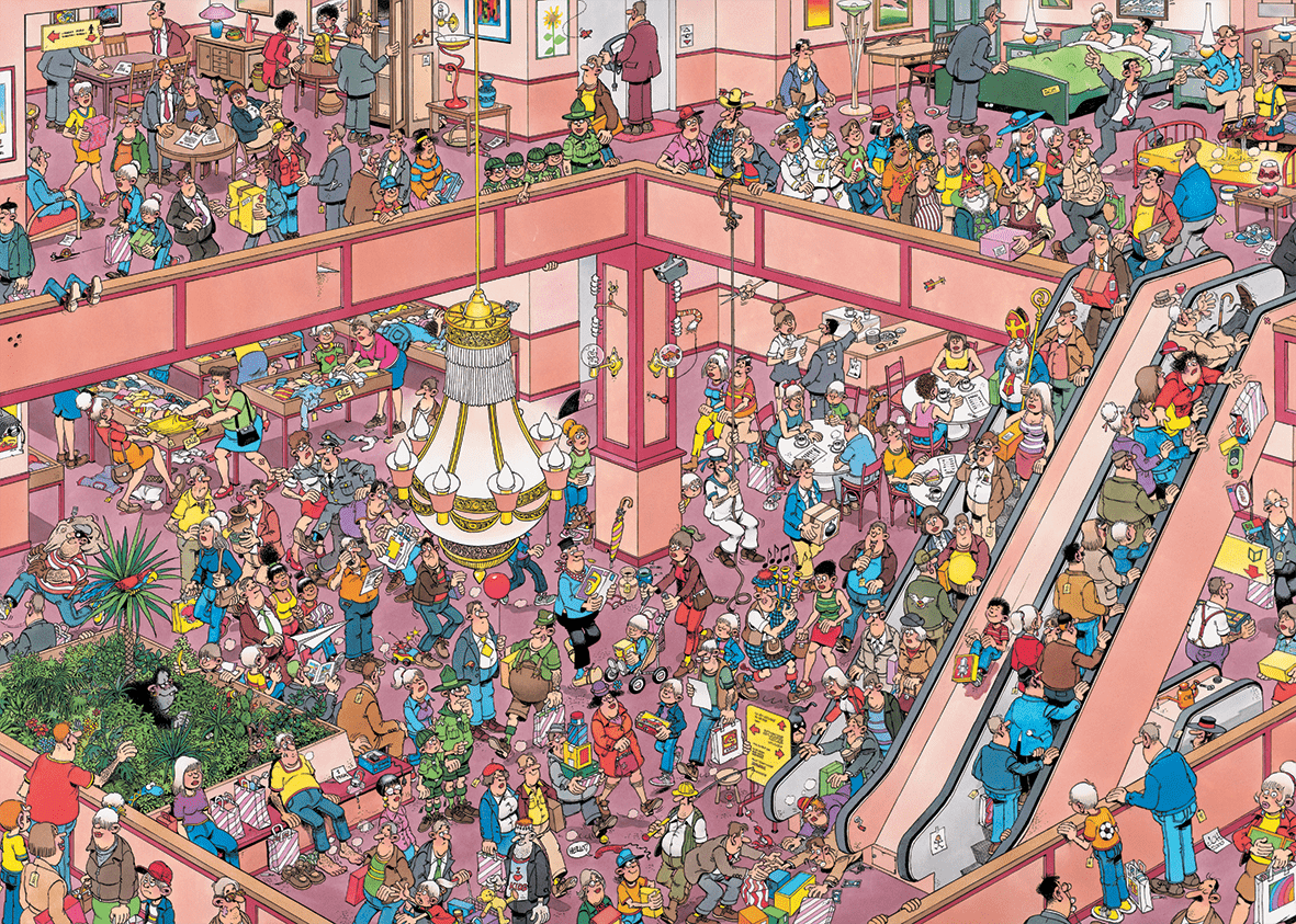 Der er travlt i stormagasinet! Overalt kæmper kunderne om de bedste tilbud, bærer rundt på bugnende poser og prøver febrilsk at finde vej gennem menneskemylderet. Som altid i Jan van Haasterens univers er kaos komplet – og fuld af sjove detaljer, der får dig til at trække på smilebåndet.