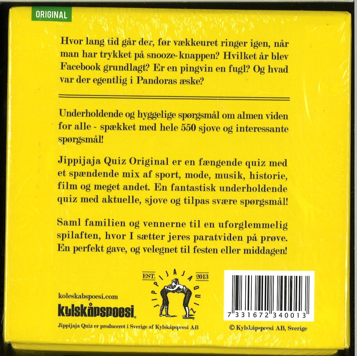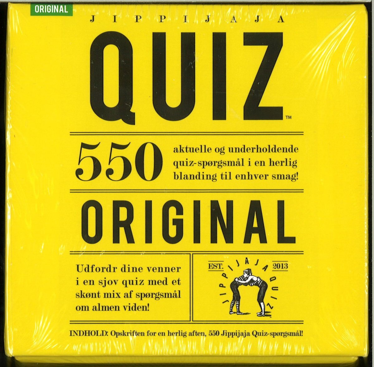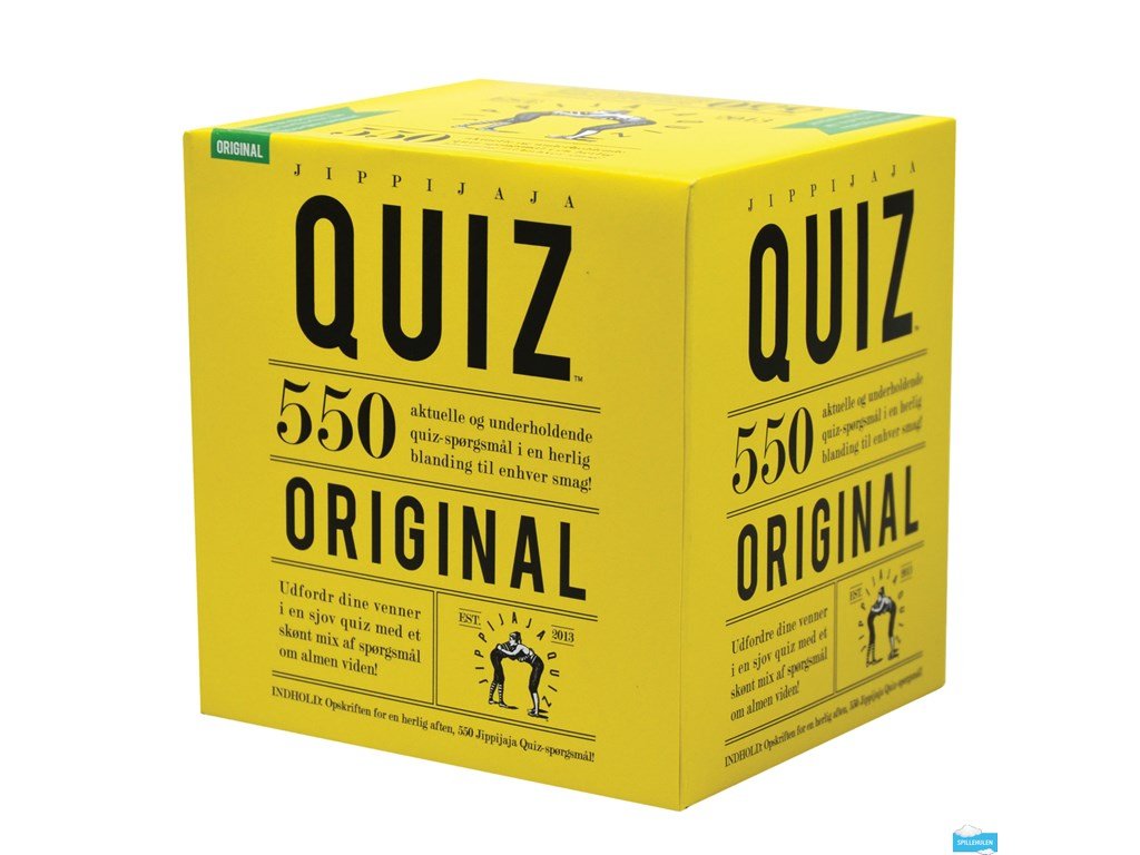 Dette sjove quizspil blev skabt i 2013, og er efterfølgende blevet meget populært. Det består i alt sin enkelthed af en masse spørgsmål, som du skal svare rigtigt på for at kunne vinde spillet. Der er intet bræt eller terning, kun en masse morsomme og lærerige spørgsmål. Spørgsmålene omhandler blandt andet musik, sport, mode, film, historie og meget mere. Ved du eksempelvis, hvornår Facebook blev grundlagt og om en pingvin er en fugl? Dette er blot nogle af de spørgsmål, som du får svar på, hvis du spiller Jippijaja Quiz Original. Spillet kan gennemføres på blot fem minutter, men det kan også give timevis af god underholdning. Spillet kræver mindst to spillere, og på grund af spørgsmålenes sværhedsgrad anbefales det at man er 15 år eller mere.