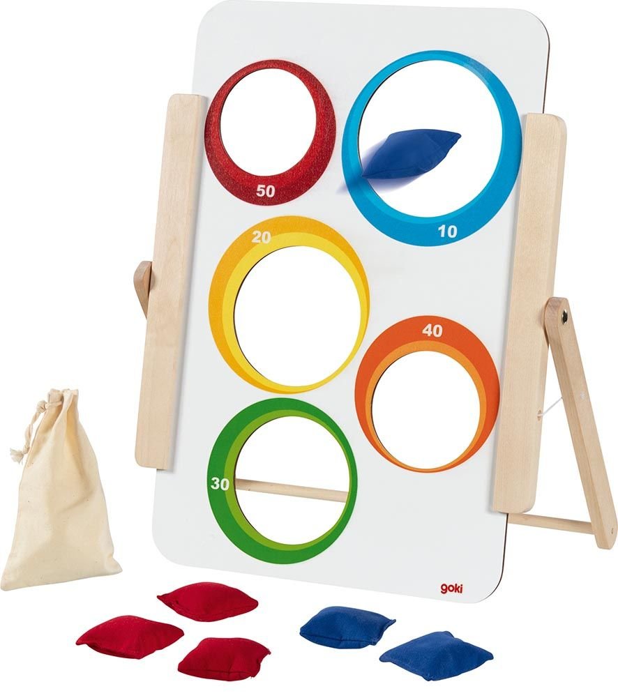Dette sjove kastespil fra Goki kan nydes af både børn og voksne. Perfekt til udendørs brug i haven eller på terrassen, og også velegnet til indendørs leg i stuen med lidt plads. Spillet inkluderer en pointtavle med huller, der har to sider: en med point og en med dyrebilleder. Pointtavlen er selvstående og lavet af holdbart træ.