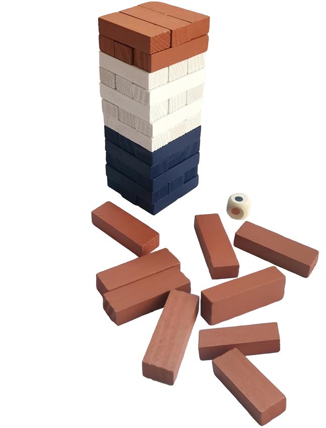 Byg tårnet ved at stable klodserne i lag á tre på skiftende led. Spillerne skiftes til forsigtigt at trække én klods ud og placere den ovenpå. Jo højere tårnet bliver, desto sværere bliver det at holde balancen. Den spiller, der får tårnet til at vælte, taber spillet. Sjovt og nemt familiespil, der træner tålmodighed og finmotorik