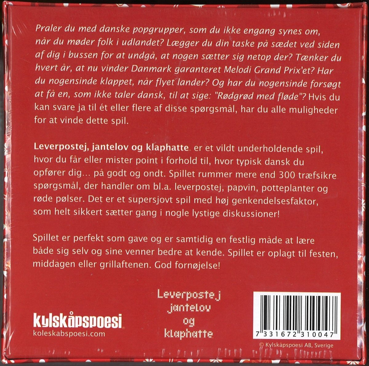 Dette underholdende spil er oprindeligt svensk, hvor det længe har været et populært indslag til en hyggelig aften. Denne udgave er naturligvis på dansk, og spørgsmålene er også tilpasset det danske samfund. Som det fremgår på navnet af spillet; Leverpostej, jantelov og klaphatte handler spillet om typiske danske ting. Der gives point og minus point, alt efter hvor stor din viden om danskheden er. Dette spil er en sjov måde at samles på og se ind ad på os selv som danskere, men det er samtidig også en underholdende måde for andre at lære om den danske kultur og til tider mærkelige vaner. Spillet er for mindst tre spillere og egner sig bedst til de 15 årige og opefter. Det tager omkring 20 minutter at spille dette sjove spil.
