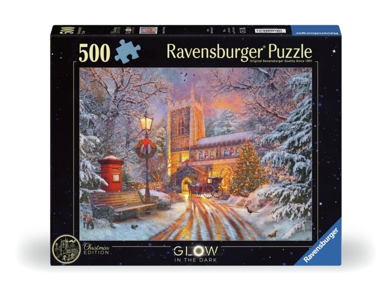 Et smukt og stemningsfuldt julemotiv, hvor sneen daler stille over landskabet, og det pyntede juletræ foran den oplyste kirke spreder varme og fredfyldt julestemning. Når puslespillet er lagt, afslører det en ekstra magi – det lyser i mørket, og forvandler motivet til en hyggelig juledekoration, perfekt til at hænge på væggen.