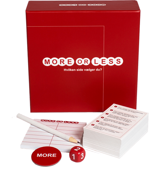 Med More or less følger der spilleregler, blok, blyant, terning og 480 forskellige spørgsmål. Se også den nye udgave More or Less 2.