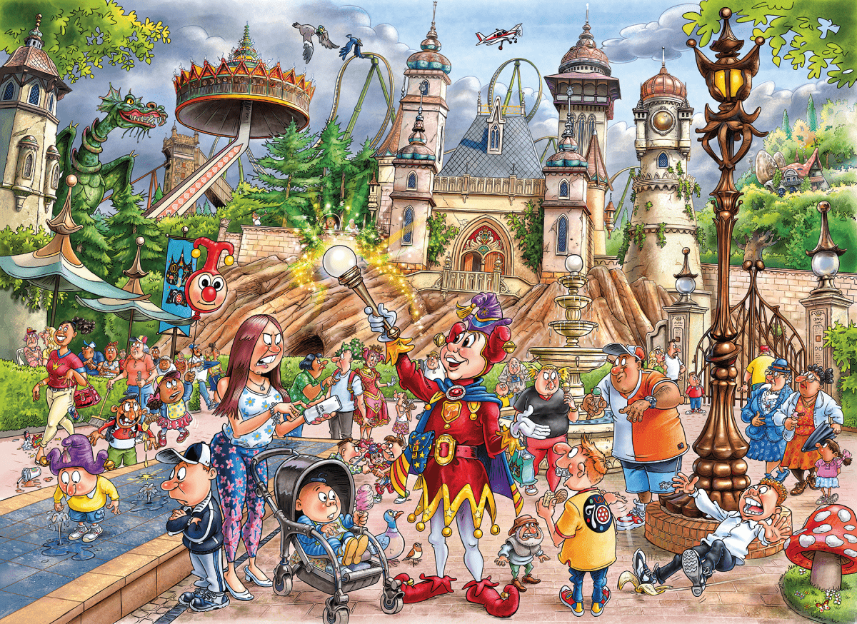Velkommen til en dag fuld af sjov og spænding i forlystelsesparken – men vil idyllen mon vare ved? I dette Wasgij-puslespil bliver du udfordret til at tænke ud over æskens forside. I stedet for at samle det motiv, du ser, skal du forestille dig, hvad der sker lige efter scenen på billedet. Brug din fantasi og opdag, hvordan dagen i parken tager en uventet drejning!