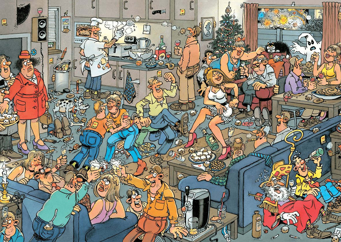 Velkommen til årets mest kaotiske nytårsfest! Her er dansegulvet fyldt, raketterne klar, og festen er i fuld gang – men som altid hos Jan van Haasteren går tingene bestemt ikke stille for sig. Overalt gemmer der sig skøre detaljer og små historier, som gør det til en oplevelse at lægge puslespillet igen og igen.