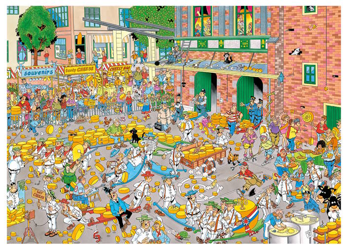 Jan van Haasteren-serien er kendt for sine farverige og humoristiske illustrationer, der tager dig med på skøre eventyr fyldt med absurde detaljer. Dette 2-i-1 puslespil indeholder to klassiske motiver, hver med 1.000 brikker og en færdig størrelse på 68 x 49 cm.