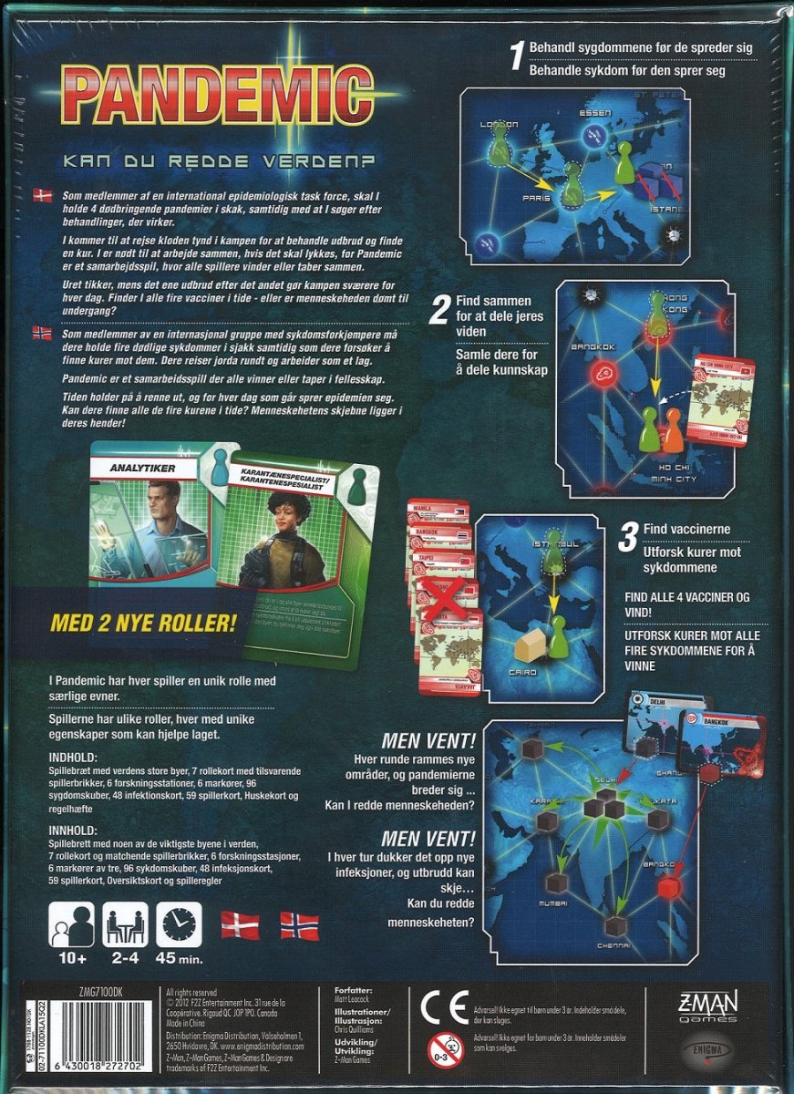 Spillet tager ca. 45 minutter, og det kan spilles fra ca. 10-års alderen. Det adskiller sig fra de fleste andre brætspil og strategispil ved at man faktisk arbejder sammen - det vil sige enten vinder alle spillerne eller også taber alle. Alle har en eksperttitel, som er nødvendig for at få stoppet sygdommene, og ved hver tur rejser man rundt i verden og gør hvad man kan indenfor sit felt for at stoppe sygdommene. Pandemic spillet er et spil mod tiden, for sygdommene truer, og der er brug for alle eksperterne (spillerne).