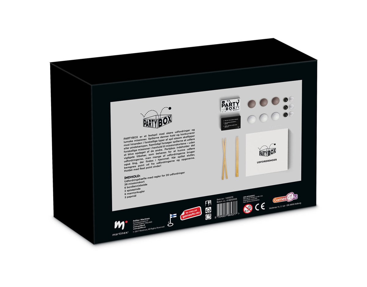 Udfordringshæfte med 20 udfordringer, 38 missionskort, 6 bordtennisbolde, 2 spisepinde, 6 marmorkugler og 3 papmål.