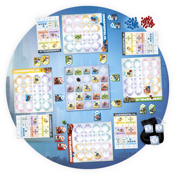 Spillet går i al sin simpelhed, ud på at samle flest Sejrs point (Victory Points) Quadropolis spilles hen over fire runder, og efter disse fire runder ser man, hvem der har opført de mest prestigefyldte byer samt kombineret dem på den bedste måde. Netop de mange bygninger, og kombinationer til hvordan man sammensætter disse på den helt optimale måde, er en af nøglerne til at trække sig sejrrigt ud af dette, underholdende familiespil. Quadropolis kan spilles efter normale regler, men hvis det dette bliver for nemt, medfølger der også et sæt ekspert regler, som kan udfordre familien endnu mere. Dette er den engelske udgave af spillet, og den findes stadig ikke på dansk. Spillet indeholder: