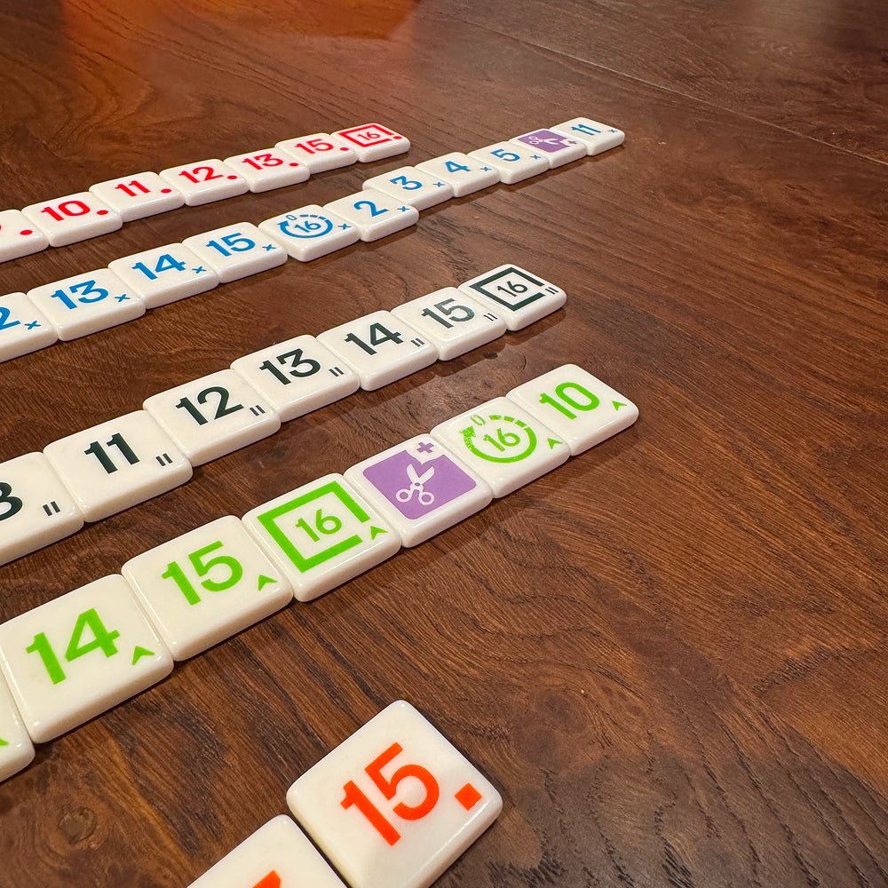 Undervejs bygges farvede rækker med stigende tal, men spillet kan hurtigt ændre retning. Restart og End brikker kan vende op og ned på en række på et øjeblik, mens Saks og Skraldespand giver mulighed for at fjerne brikker og åbne nye muligheder. Det giver masser af interaktion og sikrer, at ingen runde føles ens.