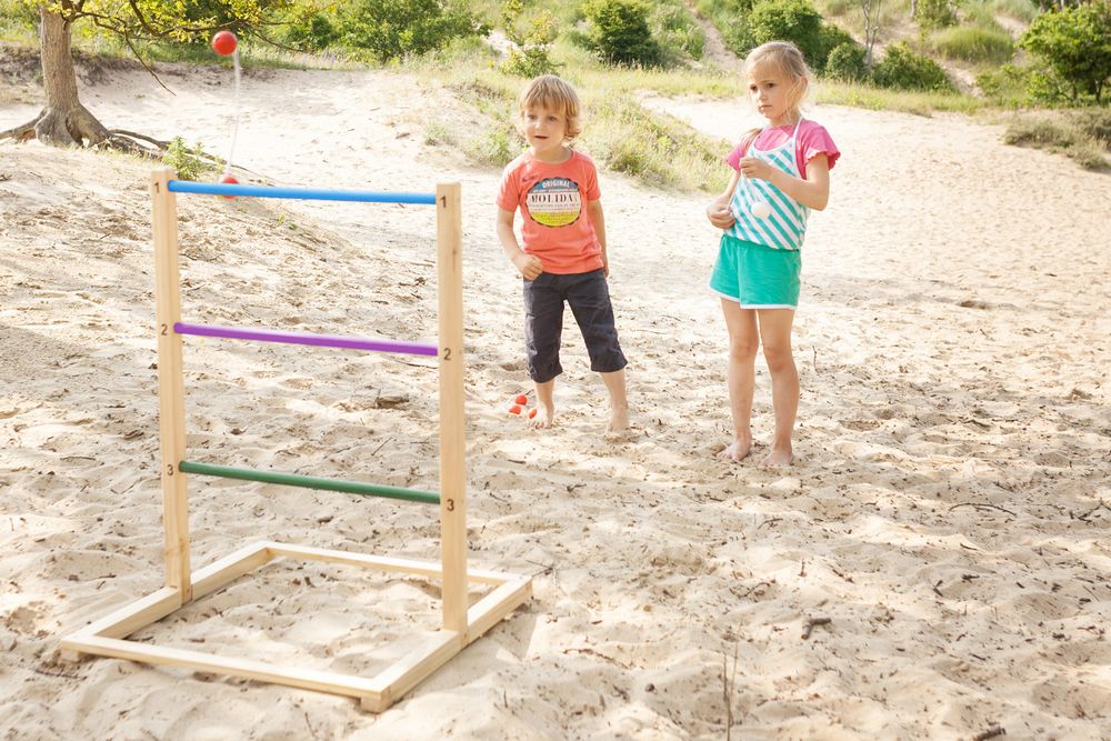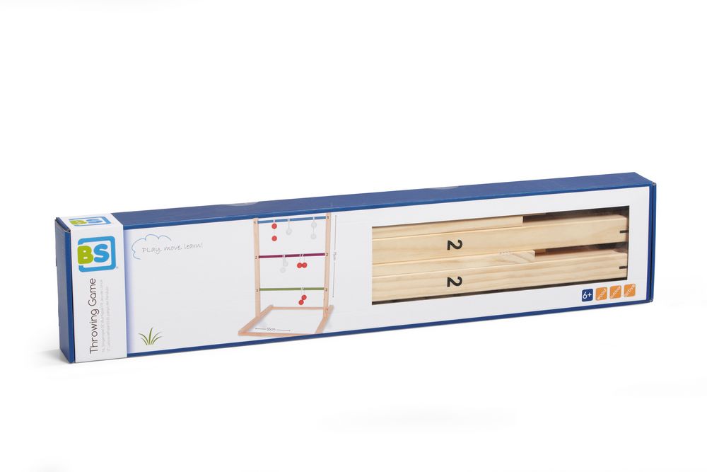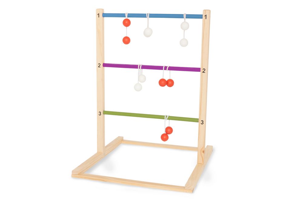 Golfboldene (Ø: 4 cm) er lavet af hård plast. Pas derfor en smule på, når du placerer spillet. Hav god afstand til husets vinduer og andre ting, der ikke må rammes af en golfkugle. Golfboldene hænger sammen 2 og 2 i hver sin ende af en snor. Når spillet begyndes skal golfboldene kastes mod stigen. Med den rette teknik kan du få golfboldene til at snore sig omkring et trin på stigen. Alt efter om du rammer det øverste, midterste eller nederste trin på stigen får du 1, 2 eller 3 point. Alle fra 6 år og opefter kan være med til at spille Stigegolf i træ. Det kræver blot 1 spiller at spille, da du faktisk kan få masser af sjov ud af at spille alene. Men er I flere kan I dele jer ud på hold og på den måde skiftes til at kaste og få point. Ét spil tager typisk omkring 10 minutter. Vær opmærksom på at stigen skal samles, når du modtager spillet. Når stigen er samlet måler den 75 x 55 cm. Du skal selv have en stjerneskruetrække for at kunne samle stigen. I denne udgave af Stigegolf er stigen lavet af træ, hvilket giver den et flot udseende. Spillet kan sagtens stå på din terrasse, når det ikke er i brug.