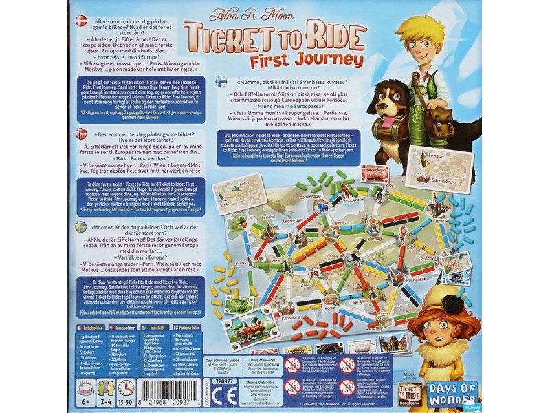 Ticket to Ride First Journey udspiller sig i Europa mellem forskellige store byer. Alle spillere får fordelt nogle ruter, som de skal udfylde på spillepladen. Det betyder at de skal lægge tog fra by til by indtil de har toge, der dækker hele ruten fra start til endestation. Når det bliver din tur kan du gøre én ud af 2 ting. Du kan enten trække kort op af bunken til din hånd. Eller du kan spille nogle af de kort, som du har på hånden. Du kan kun lave en togtrækning, hvis du har kort nok i samme farve som ruten og dermed kan bygge hele togstrækningen på én gang. Det her spil er spændende hele vejen igennem, da det ikke altid er helt simpelt at få bygget dine ruter samtidig med at de andre spillere også skal bygge deres ruter. Sommetider skal strategien lægges om og det gør spillet nervepirrende. Ved spillets ende skal der tælles point alt efter hvilket og hvor lang strækninger man har bygget og hvilket ruter man har opnået. Den med flest point vinder. Ticket to Ride – First Journey kan spilles af alle over 6 år og man kan være 2-4 spillere om et spil, der typisk tager 15-30 minutter. Dette spil er på dansk med danske spilleregler.