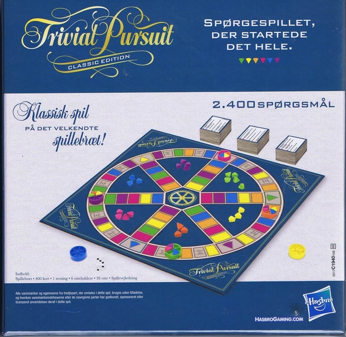 I kassen finder du det helt klassiske spillebræt, seks brikker med tilhørende oste, én terning og 2400 nye spørgsmål.
