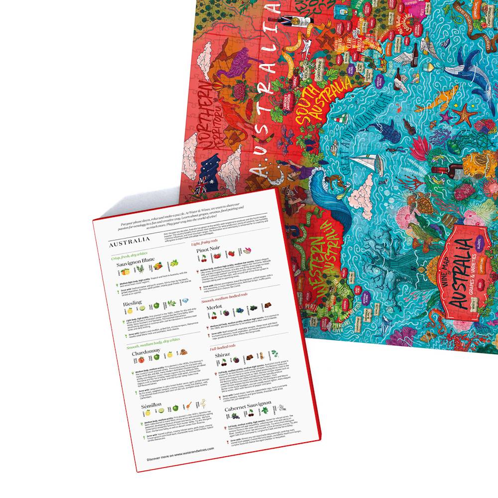 "Hvis vi tager en slurk vin, finder vi drømme, der kommer til os ud af den nært forestående nat." – D. H. Lawrence, Unrhyming Poems, 1928. Oplev den pulserende verden af australske vine med dette fantastiske tilskud til vores samling. Australien er kendt for sine Shiraz og Pinot Noir og har over 60 vinregioner. Dette australske puslespil er omhyggeligt kurateret af ekspertsommelierer og håndillustreret for at fremhæve de vigtigste vinproducerende regioner og lokale druesorter fra den berømte Barossa-dal til den kølige Yarra-dal. I æsken finder du drueprofiler og tips til madparring, hvilket gør det til en komplet vinlæringsoplevelse. Dette er mere end bare et puslespil; det er en hyldest til australske vine og det vidunderlige dyreliv, designet til at give timer af underholdning.