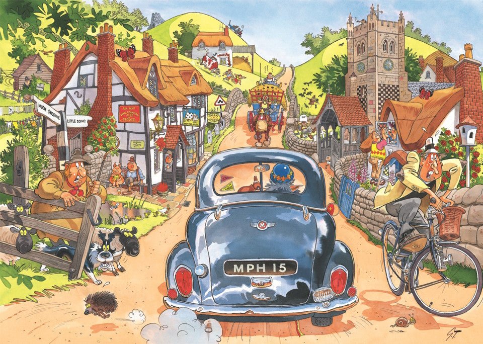 Wasgij Retro Original 1: 'Sunday Drivers' er titlen på dette utroligt underholdende 1.000-brikkers Wasgij Original puslespil. På billedet på æsken ser landsbyboerne chokerede ud, da denne bil kører gennem deres rolige, solrige landsby. Er det damerne, der kører, eller er der noget andet, der bekymrer de lokale?