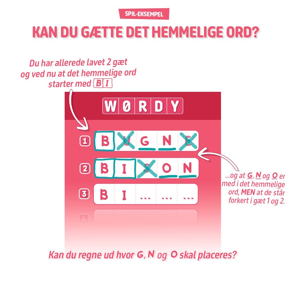 For hvert gæt får du ledetråde, der afslører hvilke bogstaver, der indgår i modstanderens hemmelige ord, og hvilke der ikke gør. Derfor er det vigtigt at overveje dine gæt nøje for at få de bedste ledetråde og knække koden.